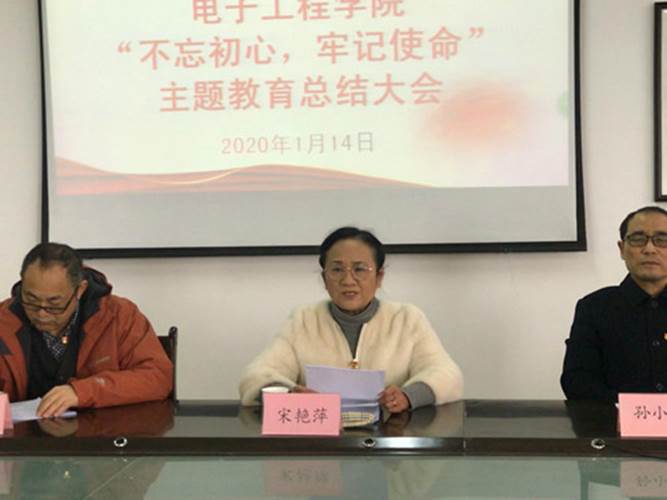 1月14日下午电子工程学院召开了“不忘初心,牢记使命”主题教育总结大会,本次会议由院长高小英主持,学校主题教育督导六组组长、校纪委办公室主任宋艳萍,督导组成员、电子商务学院办公室主任杨帆到会指导,全体教师党员参加了会议。