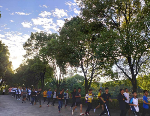 东升的旭日将阳光照射在每一位大一新生的脸颊上。各班以班级为单位站成整齐的队列整装待发。在纪检部点完名后,各班体育委员在队伍的最前方带领着班上同学围绕着蝶湖开始了跑步。同学们矫健的的身影迎着晨光随风而动,井然有序的晨跑活动形成了校园一道靓丽的风景线。