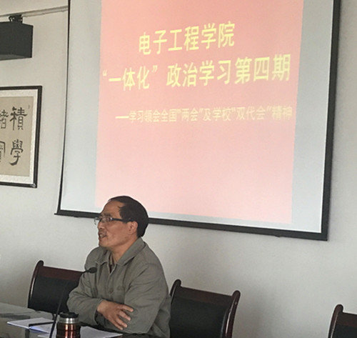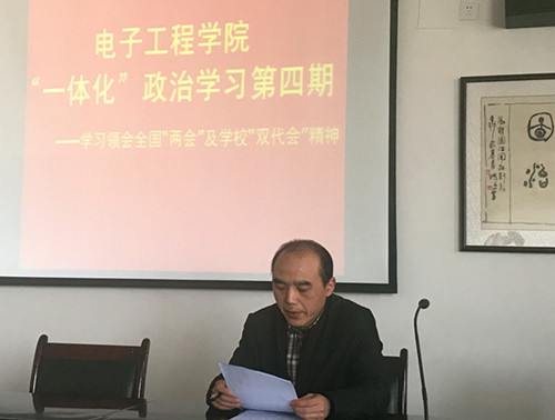 3月28日下午,电子工程学院“一体化”政治学习模式举行第四期活动,学习领会全国“两会”及学校“双代会”精神。活动由党委书记孙小明主持,全院教职工参加了活动。