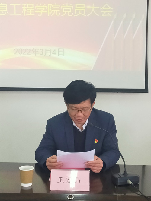 大会在雄壮的国歌声中开幕。副校长王万山同志首先发表了讲话,他首先肯定了学院工作取得的成就,并提出了三点要求:一是要坚定理想信念,旗帜鲜明讲政治;二是要推进党支部建设,树立“一切工作到支部”的鲜明导向;三是要凝心聚力促发展,创造性开展工作,坚定不移推动党风廉政建设。