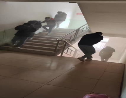 疏散演练模拟15栋3楼宿舍发现火情,火灾警报突然响起,值班人员迅速就位,启动消防安全预案,组织疏散,同学们由寝室长带领按照“低姿、弯腰、捂口鼻”口诀,根据引导有序撤离,整个演练过程组织有序,疏散迅速。