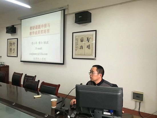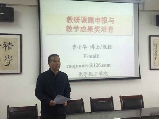 3月31日下午,我院特邀化学化工学院副院长曹小华博士在竞知楼904会议室作《教研课题申报与教学成果奖培育》主题讲座。讲座由院长邓长寿主持,全体教职工聆听了讲座。