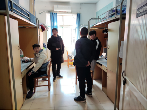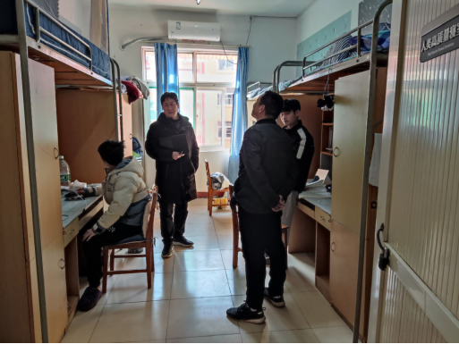 检查中,大家分工协作,全面普查,同时提醒学生,天气变冷,年关将近,注意防火防盗防事故;注意节能减排,空调温度不要超过20度;注意疫情防控,加强寝室通风,做好个人防护,尽早与家人团聚。