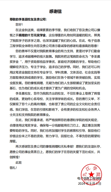 本学期开学后,经朱科长联系,校友李圣晨慷慨捐赠,于9月6日完成了捐款。我院也向李圣晨发出了感谢信,并邀请李校友抽空回校办理捐赠仪式。