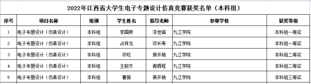 在刚刚结束的2022年江西省大学生电子专题设计(仿真设计)大赛中,我院由李国泉、占祥龙、邓松、王骏杰、曹振、涂文一、沈磊、周丰超8名学生组成队伍参赛,共斩获一等奖2项、二等奖2项、三等奖1项,获奖比例远高于赛事一等奖8%、二等奖10%、三等奖12%的获奖比例。总成绩在所有参赛队伍中排名前列。