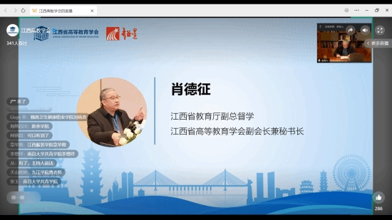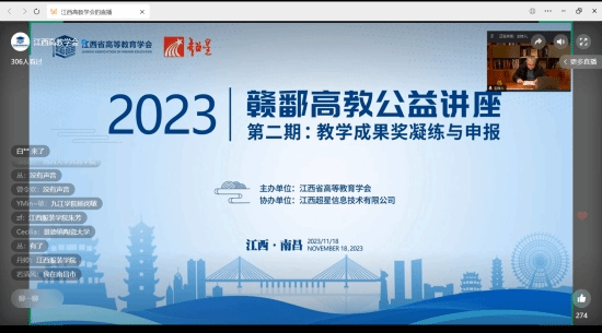 2023年11月18日上午,江西高等教育学会举办“聚焦教育数字化,赋能教学新优势”系列赣鄱高教公益讲座(第二期:教学成果奖凝练与申报),活动采用线上直播的形式进行。电子信息工程专业学科带头人曹晖,电子信息工程教研室主任高玉宝、副主任何俊及电子信息工程教研室全体教师参加了此次讲座。