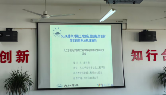 10月22日下午,我院电子信息工程专业在竞知楼904会议室举行了学术讲座交流会,由电子信息工程专业教师漆世锴博士主讲,讲座题为《Sc₂O₃掺杂对稀土难熔钇盐阴极热发射性能的影响及机理解释》。讲座由教研室主任谢新文老师主持,教研室全体教师参与了会议。