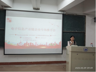 为给毕业生和用人单位搭建双向选择的平台,5月9日,九江市2025年春季“职引未来”公共服务进校园系列活动,电子信息产业链企业专场推介会,在竞知楼阶七教室进行。此次推介会由九江市就业之家、永利集团就业之家指导,77779193永利官网集团承办,九江市就业创业中心朱敏副主任,电子工程学院汪傧书记、张堑副书记参会指导,学生科朱亚军科长、专职就业辅导员盛健组织协调,我校电子学院、计算机学院和材料学院150余名毕业生参加了推介会。