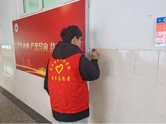 参加活动志愿者在清理过程中仔细认真、一丝不苟,逐间教室清理门上、门边、内外墙面的小广告、胶水胶带旧痕迹、过期宣传海报等,彻底清理了沉积多年的广告及其黏合剂痕迹,并把安装教室音箱时拿下来的宣传字画重新装上,教室环境焕然一新,令人舒心悦意。